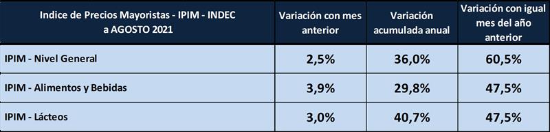 Índice de Precios Internos Mayoristas – IPIM – Lácteos – agosto 2021 22/9/2021