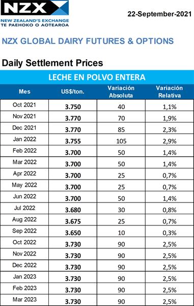 Precio de la Leche en Polvo Entera en el Mercado de Futuros 22/9/2021
