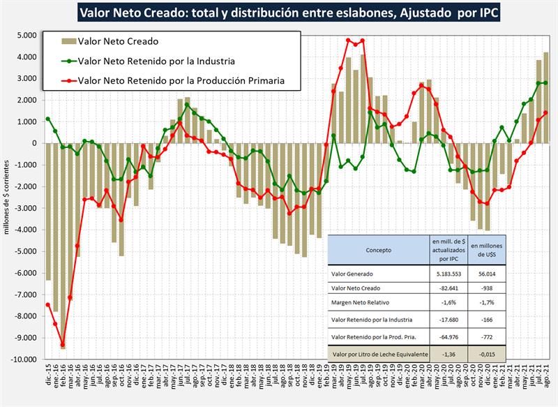 En el gráfico de arriba se puede ver la evolución del valor creado general y por los dos principales eslabones de la cadena, actualizados por el índice de precios al consumidor. Además se presenta un cuadro resumen donde se ven los resultados acumulados desde diciembre 2015 a agosto 2021 tanto en pesos constantes como en dólares y es de remarcar que al sector le faltó durante todo éste período unos US$ 0,015 por litro de leche para estar en equilibrio, es decir, pagar todos sus costos en efectivo directos e indirectos, mantener el capital y lograr un costo de oportunidad del mismo.