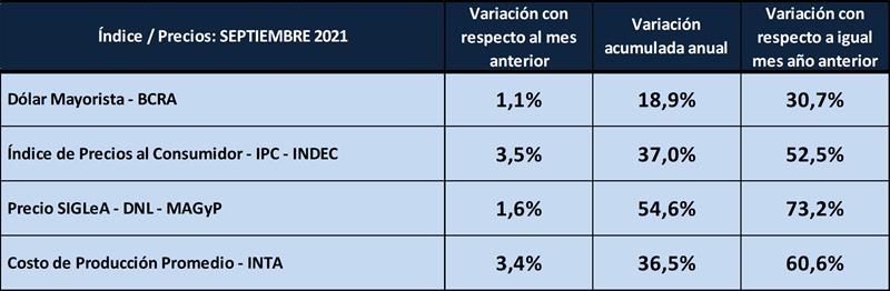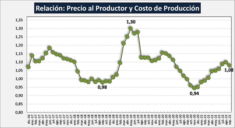 Si miramos los precios de la leche al productor, subieron en los últimos 12 meses el 73,2% y los costos promedio el 60,6%. Cabe recordar que la mejora porcentual de precios lo hace desde una zona de rentabilidad negativa. Por otra parte si miramos la relación precio/costo que subió desde noviembre 2020 a agosto 2021, en septiembre 2021 a pesar que sigue en un valor mayor a uno, ha caído.