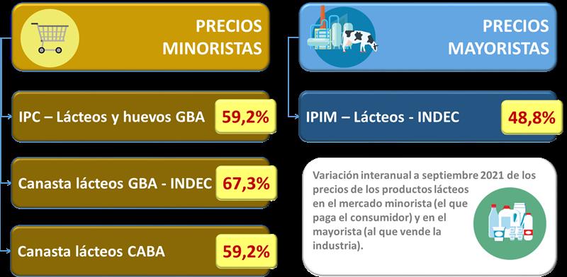 Variación interanual de los precios minoristas y mayoristas de los productos lácteos 25/10/2021