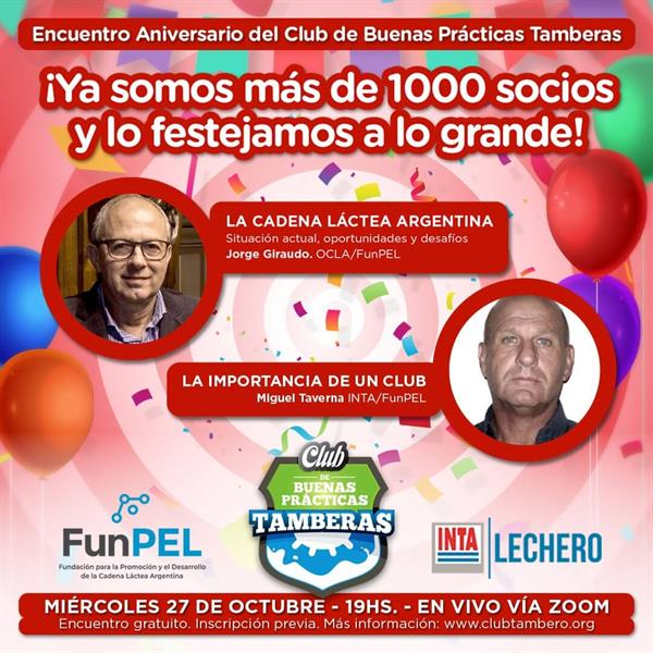 - Por eso nos invitan a formar parte de este encuentro aniversario el cual contará con la participación especial de Jorge Giraudo, director ejecutivo del OCLA, quien hablará sobre la Cadena Láctea Argentina, la situación actual, oportunidades y desafíos.- Además Miguel Taverna, integrante del club y referente del INTA y FunPEL, contará sobre el rol estratégico de las Buenas Prácticas para nuestra lechería nacional, los logros del CLUB y cómo se proyectan para los próximos años.