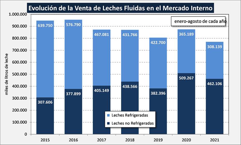 En el gráfico siguiente se presentan las ventas (en miles de litros) del período enero-agosto de cada año de leche fluida (refrigeradas y no refrigeradas), donde se puede ver por un lado el descenso generalizado en la venta de leches fluidas (al menos las que captura la Resolución 230), además como van creciendo en participación las leches no refrigeradas en detrimento de las leches refrigeradas, y que la fuerte caída de este año es producto de comparar con una base alta del año pasado donde hay efectos del fenómeno “pandemia/cuarentena”. Una situación similar ocurre para las leches en polvo tanto enteras como descremadas.