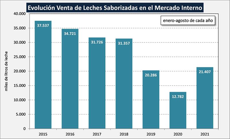 Por otra parte en el gráfico de abajo se ve, cómo productos como las leches saborizadas o chocolatadas, que presentan una muy alta tasa de crecimiento en los ocho primeros meses del año 2021 (67,5%), es sólo por efecto de comparar con un año como el pasado, donde las ventas fueron, extremadamente bajas, y se continúa con la tendencia de caída de ésta categoría.