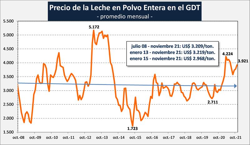 En el gráfico superior podemos observar la evolución promedio mensual de las cotizaciones del Global Dairy Trade (GDT) desde julio 2008 a noviembre 2021. En los primeros meses de éste año asistimos a una fuerte suba del precio de la leche en polvo entera (LPE) que llegó a US$ 4.224 luego comenzó sistemáticamente a disminuir el precio hasta los US$ 3.552 de la segunda subasta de agosto (-15,9%), y desde la primer subasta de septiembre que sube a US$ 3.691 no ha dejado de subir consolidando la suba, alcanzando los US$ 3.921/ton. en el día de hoy. Los valores de las 21 subastas de 2021 son en promedio US$ 3.832/ton., los mayores luego de 2013 (US$ 4.677), con lo cual mantienen al mercado externo en este producto, como atractivo para los exportadores, ya que se ubican también bastante por encima de la media histórica que está en torno a los US$ 3.209/ton. en la serie de 13 años y en US$ 2.968/ton en la serie de los últimos 6 años.