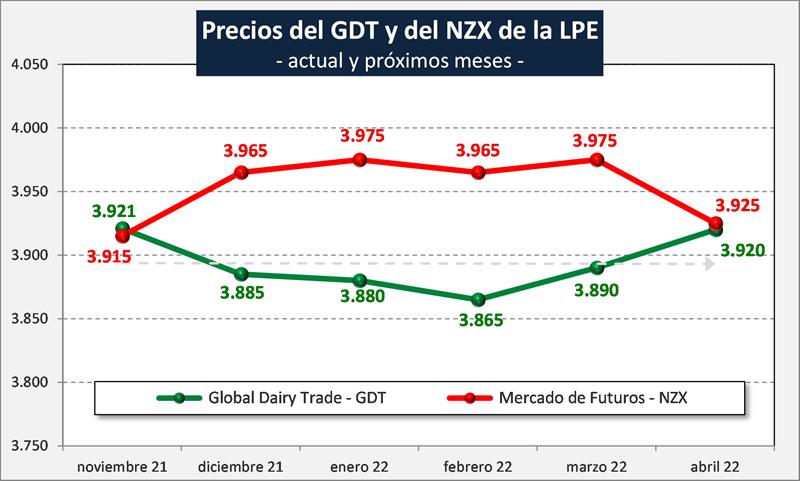 Los precios actuales y futuros del GDT pueden verse tanto en el cuadro superior como en el gráfico de abajo y están comparados con los precios que arroja el mercado de Futuros del NZX, qué en los últimos meses venía con una diferencia importante a favor al GDT, y en las últimas cotizaciones los valores son más parecidos (incluso mejores los del NZX) y ambos marcan una tendencia de precios altos sostenidos para los próximos meses. Estos mayores valores del NZX respecto al GDT, evidencian lo indicado más arriba, el debilitamiento de las compras de China.