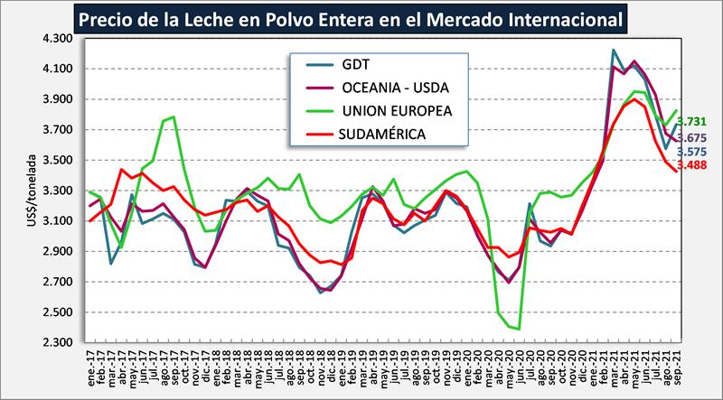 El diferencial de precios logrado para la Leche en Polvo Entera entre Nueva Zelanda, la Unión Europea y Sudamérica, se evidencia claramente en el gráfico siguiente: