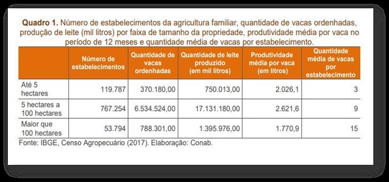 También según el Censo Agropecuario (2017), en cuanto al número de vacas ordeñadas, la agricultura familiar concentra el 67,2% de todo el rebaño, lo que corresponde a 7,7 millones de cabezas, lo que confirma su importancia en la cadena de producción de leche.