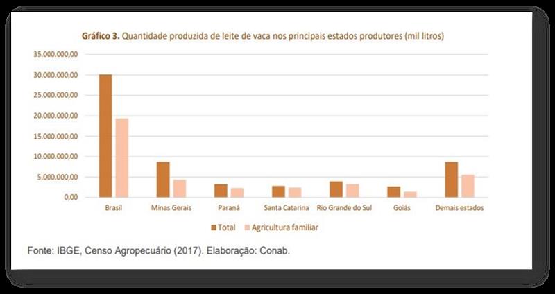 Según la Encuesta Municipal de Ganadería 2020, realizada por el Instituto Brasileño de Geografía y Estadística - IBGE, Brasil produjo 35,4 mil millones de litros de leche, siendo Minas Gerais el principal estado productor, responsable del 27% de toda la producción nacional. Según el Censo Agropecuario (IBGE, 2017), la agricultura familiar fue responsable del 57% de toda la producción de leche en el país, que, en ese año, fue de 30,1 mil millones de litros.