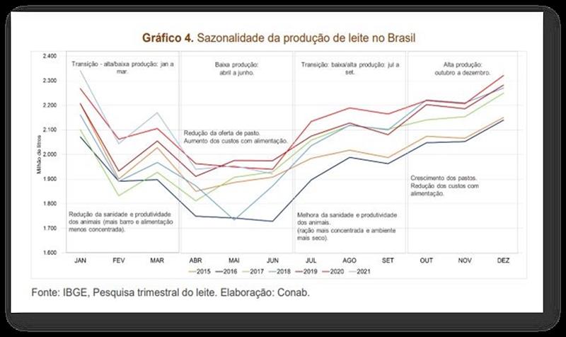 Tradicionalmente, el segundo trimestre del año viene marcado por una fuerte caída de la producción, debido a la llegada del otoño y la consiguiente reducción de la oferta de pastos. Mientras que a partir de septiembre, inicio de la temporada de lluvias en las principales regiones productoras, la producción tiende a crecer nuevamente, alcanzando su pico entre diciembre y enero.