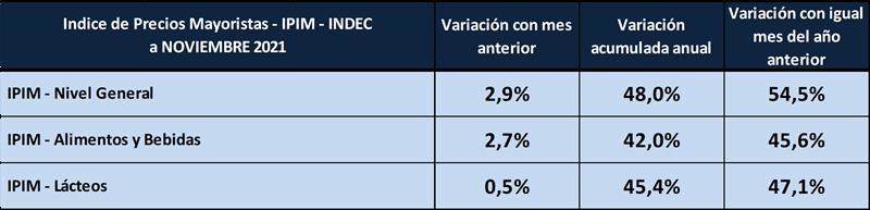 Índice de Precios Internos Mayoristas – IPIM – Lácteos – noviembre 2021 22/12/2021