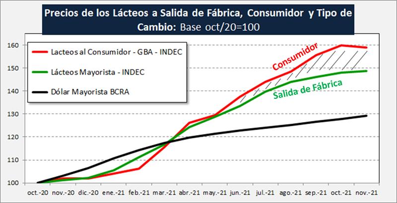 El índice mayorista de precios de los Lácteos registró un aumento de 0,5% en noviembre de 2021 respecto del mes anterior, un incremento del 45,4% en enero-noviembre y acumula una suba del 47,1% en los últimos 12 meses.