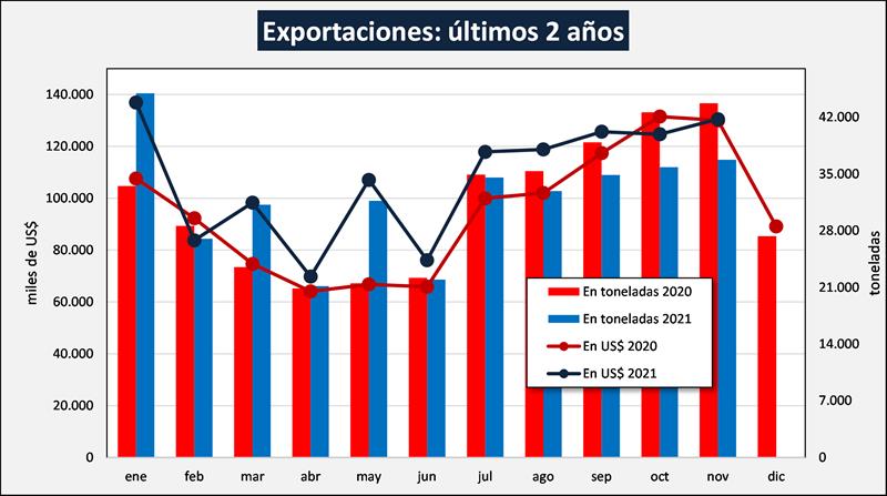 La variación intermensual de las exportaciones fue de +2,5% en volumen y de +4,6% en valor (nov/21 vs. oct/21). La variación interanual de noviembre 2021 fue de -15,9% en volumen y -+0,3% en valor (nov/21 vs. nov/20).