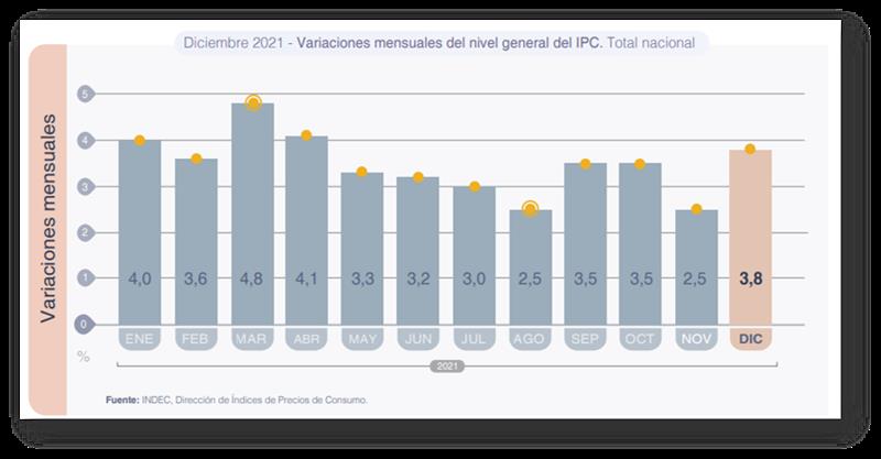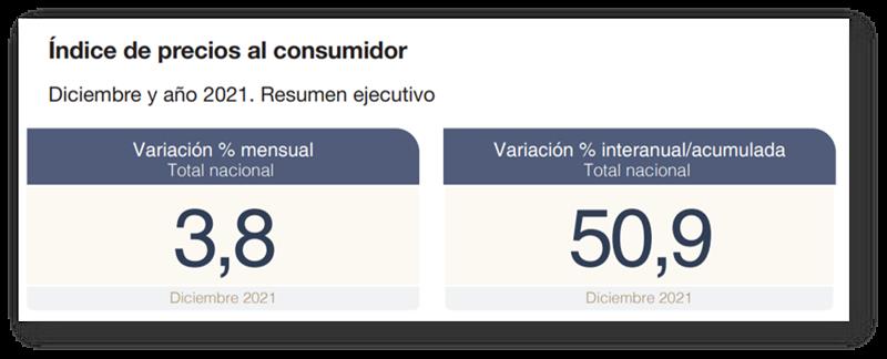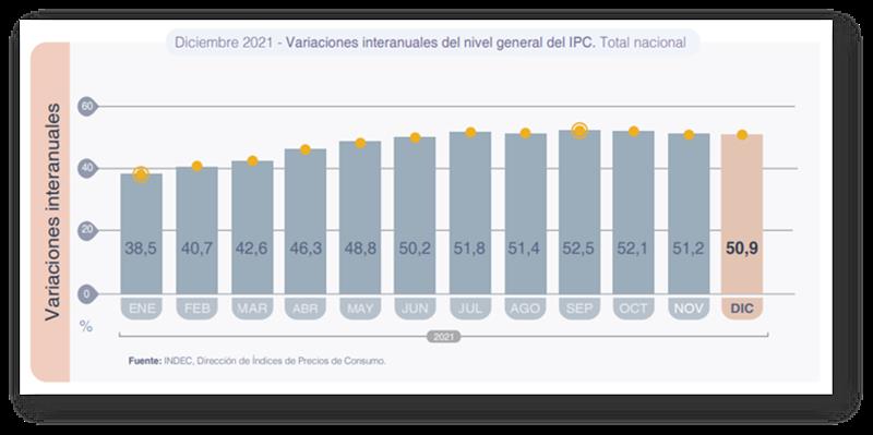 El nivel general del Índice de precios al consumidor (IPC) representativo del total de hogares del país registró en diciembre una variación de 3,8% con relación al mes anterior, y del 50,9% en el interanual.