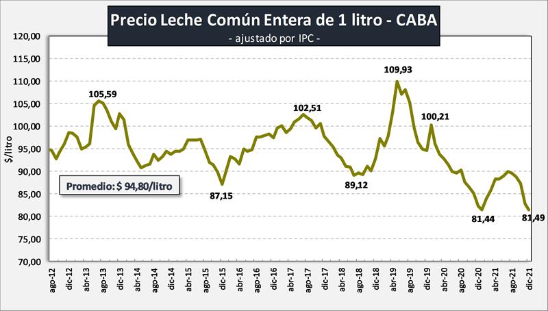 Según datos publicados por la Dirección General de Estadísticas y Censos - Ministerio de Hacienda del Gobierno de la Ciudad de Buenos Aires, los precios de los productos lácteos de esta canasta, tuvieron un crecimiento mensual promedio ponderado del 2,3% e interanual del 61,4%. El ponderado es elaborado por OCLA sobre el mismo criterio mencionado para la canasta GBA de INDEC.