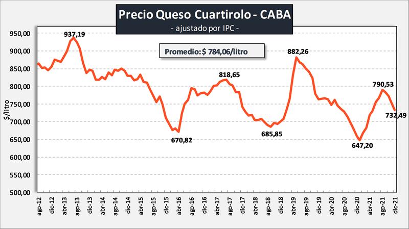 En el caso del queso cuartirolo, tiene una situación bastante similar a la planteada en el caso de la leche fluida. Estuvo en descenso prácticamente dos años, con recupero en los primeros ocho meses del 2021, pero en diciembre está -6,6% que el promedio y 17,0% por debajo del máximo de mediados del 2019 y 21,8% por debajo del máximo de esta serie a mediados del 2013, lo cual marca claramente una tendencia descendente en el precio en esta serie histórica de 10 años.