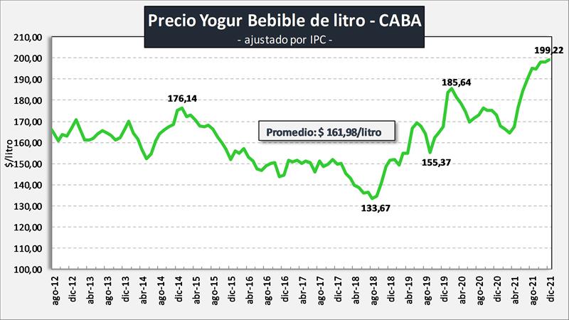 La situación de los yogures bebibles de litro es diferente, sostienen el nivel de consumo de la categoría, sus precios se ajustaron con el ritmo inflacionario, frenándose en los últimos dos meses de 2021. Lamentablemente tiran para abajo el promedio del mix, ya que su aumento de ventas no fue acompañado por las ventas de yogures en pote, postres y flanes que tienen un mayor valor por litro equivalente.