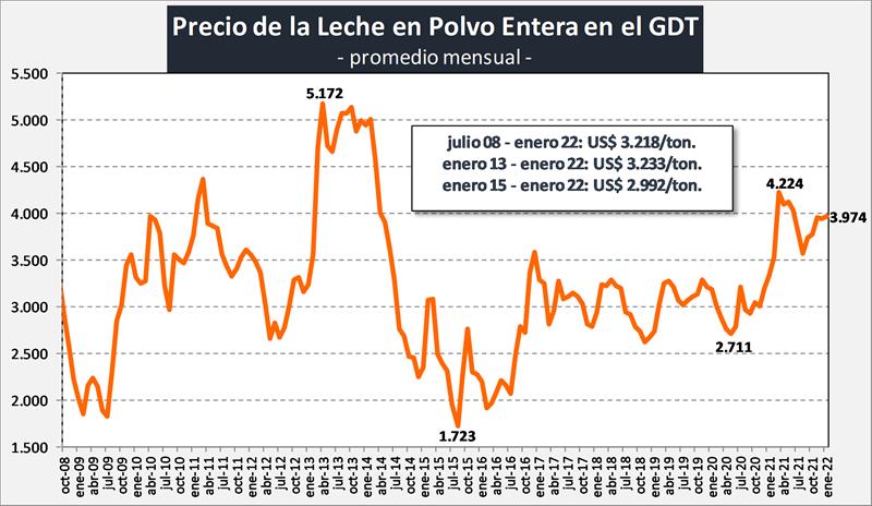 El valor promedio de las últimas 24 subastas (febrero 2021 y enero 2022) US$ 3.896/ton., los mayores luego del año 2013 (US$ 4.677), con lo cual mantienen al mercado externo en este producto, atractivo para los exportadores, ya que se ubica también bastante por encima de la media histórica que está en torno a los US$ 3.218/ton. en la serie de 14 años y en US$ 2.992/ton en la serie de los últimos 7 años.
