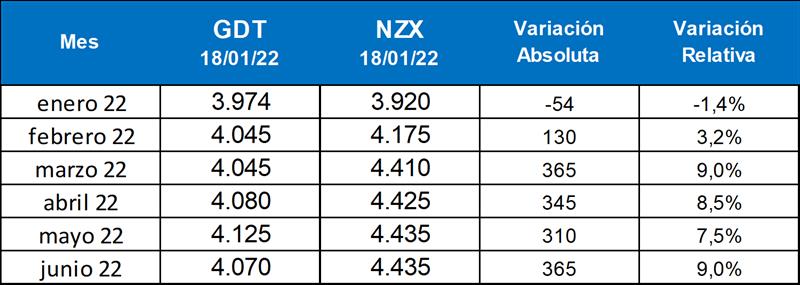 Los precios futuros del NZX superan holgadamente al del GDT, debido fundamentalmente a la menor demanda de China de los últimos meses y la incertidumbre futura respecto al comportamiento de la misma.