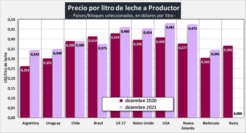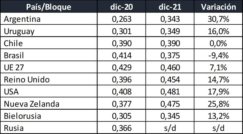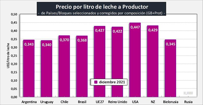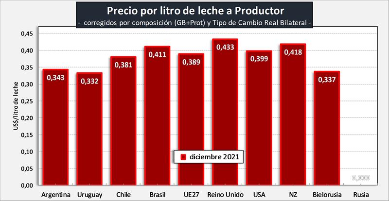 Observaciones: los precios en el gráfico de arriba han sido corregidos sólo por sólidos útiles (grasa butirosa y proteína) y no por el resto de componentes que hacen a la calidad higiénica y sanitaria, ni tampoco por tipo de cambio real bilateral con cada uno de esos países/bloques.