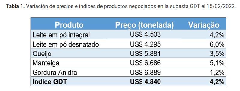 Todos los productos presentaron variaciones positivas en la segunda subasta de febrero de 2022, siendo las variaciones más expresivas la leche en polvo descremada (+6,0%, cerrando en US$ 4.295/ton) y la manteca (+5,1%, cerrando en US$ 4.051/ton)