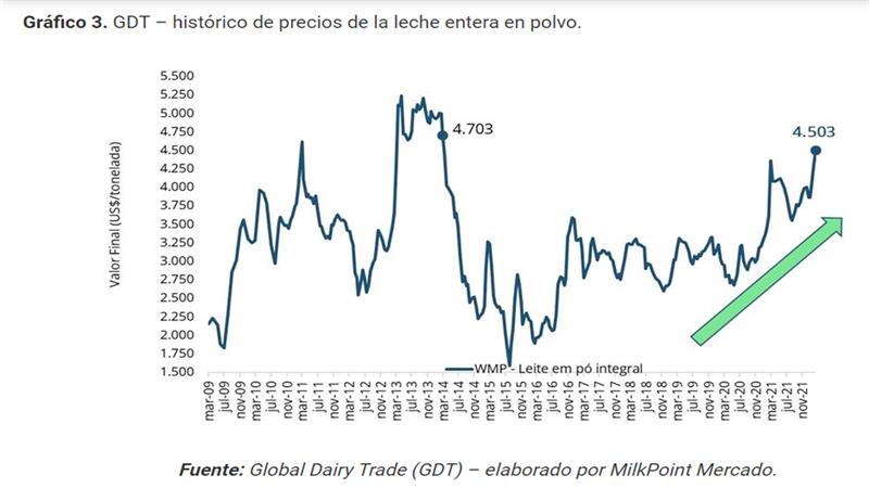 Vale destacar que a pesar de las negociaciones internacionales, como que las importaciones y exportaciones de productos lácteos de Brasil son en gran parte de países del Mercosur (como Argentina y Uruguay, con aproximadamente el 87% del volumen negociado de importaciones provenientes de estos países en 2021), la subasta Los precios GDT reflejan directa e indirectamente la dinámica del mercado lácteo brasileño. Los precios internacionales practicados en la GDT son parámetros e indicadores para los demás precios internacionales.