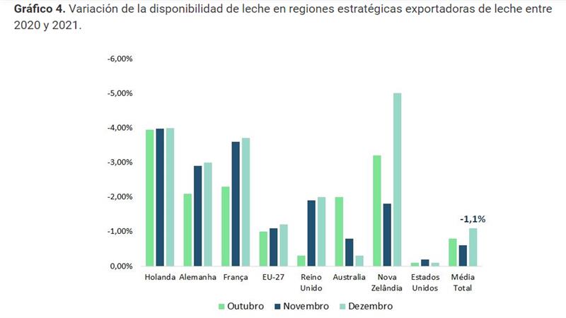 Los principales países productores han presentando obstáculos en la producción de leche, afectando la disponibilidad mundial, y consecuentemente el abastecimiento de leche. Prácticamente la totalidad de los principales países exportadores de leche de la Unión Europea presentaron variaciones negativas al comparar los meses de octubre, noviembre y diciembre, demostrando que la menor disponibilidad de leche se ha venido durante los últimos tres meses, como podemos observar en el siguiente gráfico.
