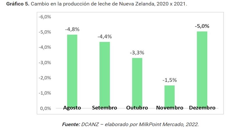 La situación en Nueva Zelanda, el mayor exportador de lácteos del mundo, es aún más negativa. Desde agosto el país enfrenta problemas en la producción de leche. El mes de diciembre de 2021 presentó una producción total de 2.603.000 toneladas, mientras que en igual período de 2020 el valor fue de 2.741.000 toneladas, una disminución del 5,0%.