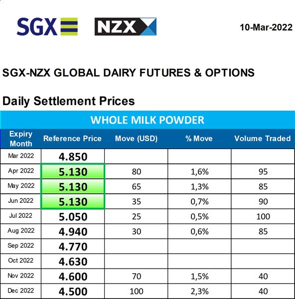 Mercado de Futuros NZX – Leche en Polvo Entera 10/3/2022