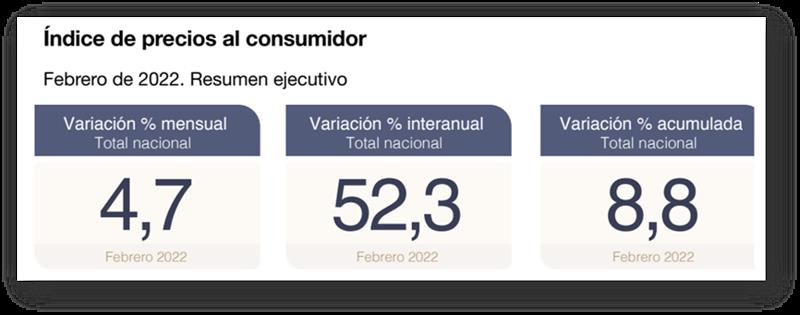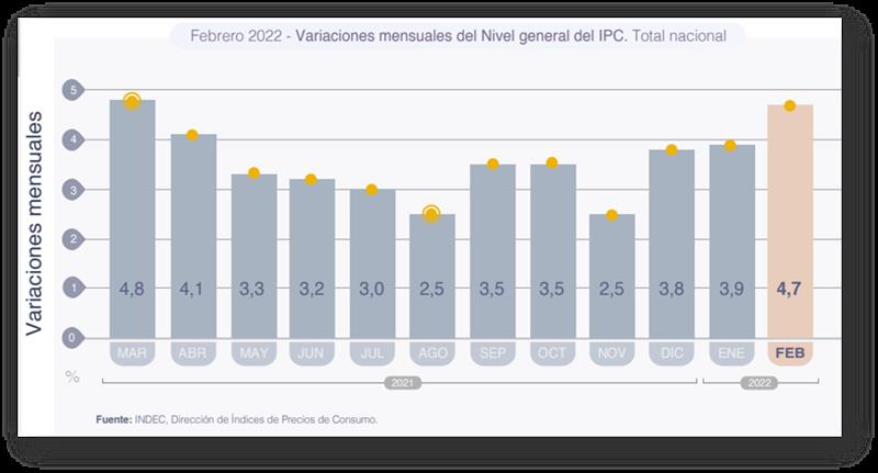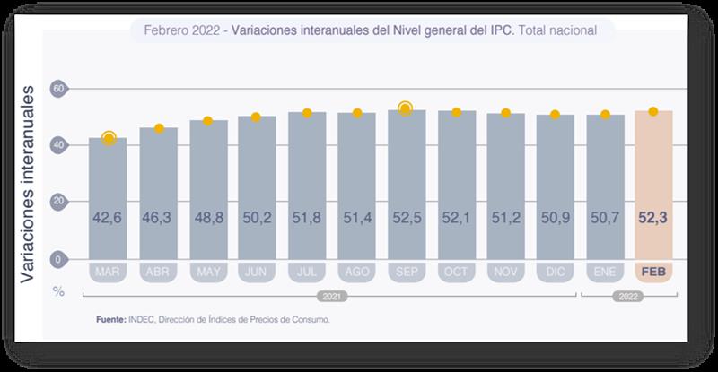 El nivel general del Índice de precios al consumidor (IPC) representativo del total de hogares del país registró en febrero una variación de 4,7% con relación al mes anterior, 8,8% en el primer bimestre y del 52,3% en el interanual.