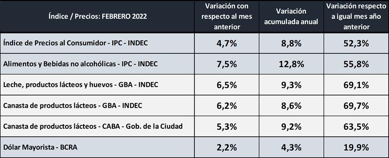 Precios de los lácteos al mes de febrero de 2022 15/3/2022