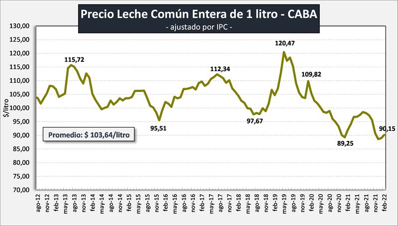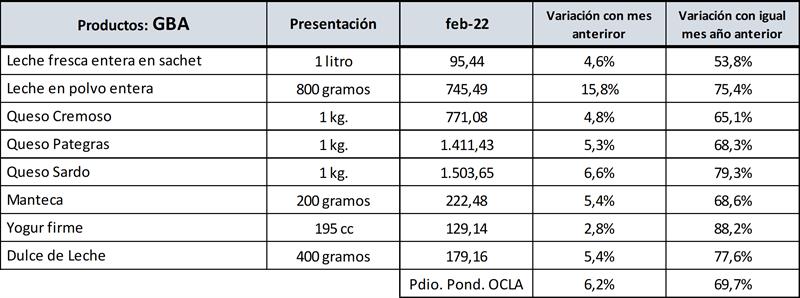 Según datos publicados por la Dirección General de Estadísticas y Censos - Ministerio de Hacienda del Gobierno de la Ciudad de Buenos Aires, los precios de los productos lácteos de esta canasta, tuvieron un crecimiento mensual promedio ponderado del 5,3%, bimestral del 9,2%, e interanual del 63,5%. El ponderado es elaborado por OCLA sobre el mismo criterio mencionado para la canasta GBA de INDEC.