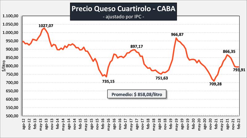 En el caso del queso cuartirolo, tiene una situación bastante similar a la planteada en el caso de la leche fluida. Estuvo en descenso prácticamente dos años, con recupero en los primeros ocho meses del 2021, y en febrero 2022 está -7,5% que el promedio y 17,9% por debajo del máximo de mediados del 2019 y 22,7% por debajo del máximo de esta serie a mediados del 2013, lo cual marca claramente una tendencia descendente en el precio en esta serie histórica de 10 años.