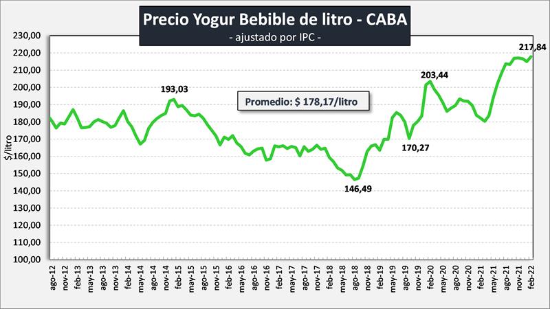 La situación de los yogures bebibles de litro es diferente, sostienen el nivel de consumo de la categoría, sus precios se ajustaron con el ritmo inflacionario, frenándose en los últimos dos meses de 2021, cayendo en enero de 2022 y recuperando un 1,3% en febrero último. Lamentablemente tiran para abajo el promedio del mix, ya que su aumento de ventas no fue acompañado por las ventas de yogures en pote, postres y flanes que tienen un mayor valor por litro equivalente.