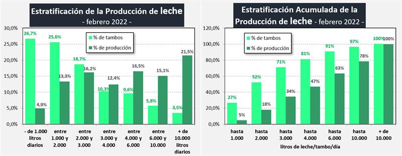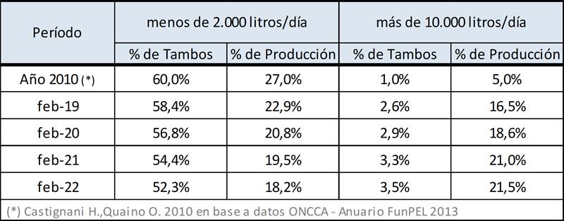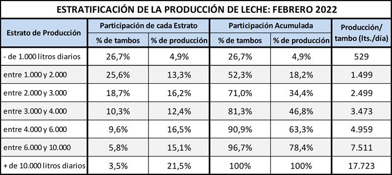 Puede verse en los meses de febrero de los últimos cuatro años (2019-2022), y también comparado con datos disponibles del año 2010, que en un extremo disminuye la participación tanto en cantidad de tambos como en el volumen de producción de las unidades productivas de menos de 2.000 litros diarios y en el otro extremo de la estratificación, se incrementa la participación de las unidades de más de 10.000 litros diarios.