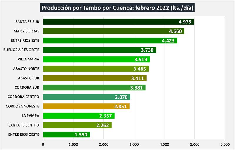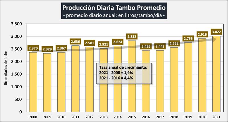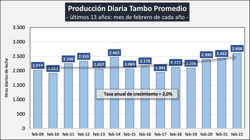 Sobre la base de la producción mensual y la cantidad anual de tambos (SENASA), podemos inferir el tamaño del tambo promedio, unos 2.606 litros de leche diarios para febrero de 2022, un 7,2% más que el año anterior. Si evaluamos su comportamiento en el tiempo, a pesar de la disminución en el número de unidades productivas y en el número de vacas, el tambo promedio presenta en el período 2009-2022 una tasa de crecimiento acumulada anual del 2,0%, lo que permite el sostenimiento e incluso aumento de los niveles productivos agregados a nivel país.