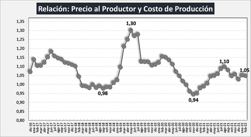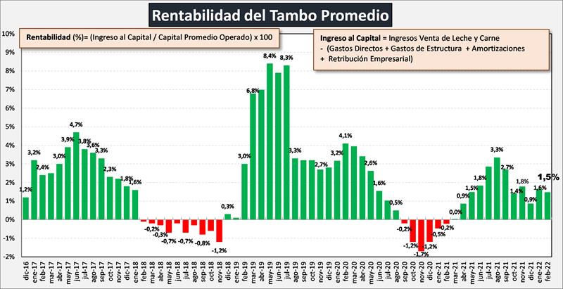 Desde marzo de 2021 el precio al productor (aunque con altibajos) supera el costo de producción de leche (relación superior a 1), pero en ningún momento alcanza al precio de equilibrio, que exige una rentabilidad sobre el capital operado del 5% anual, ya que la rentabilidad promedio de ese período fue del 1,7% con extremos entre 0,0% y 3,3%.