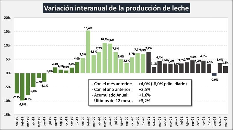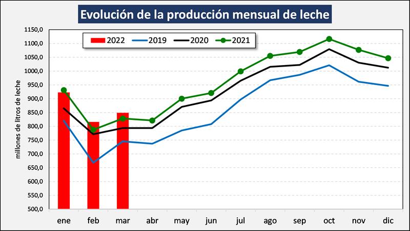 En el mes de marzo de 2022 la producción fue de 848,9 millones de litros de leche, esto implica un valor 4,0% por encima del mes anterior (-6,0% en el promedio diario) y un 2,5% más que igual mes del año anterior.