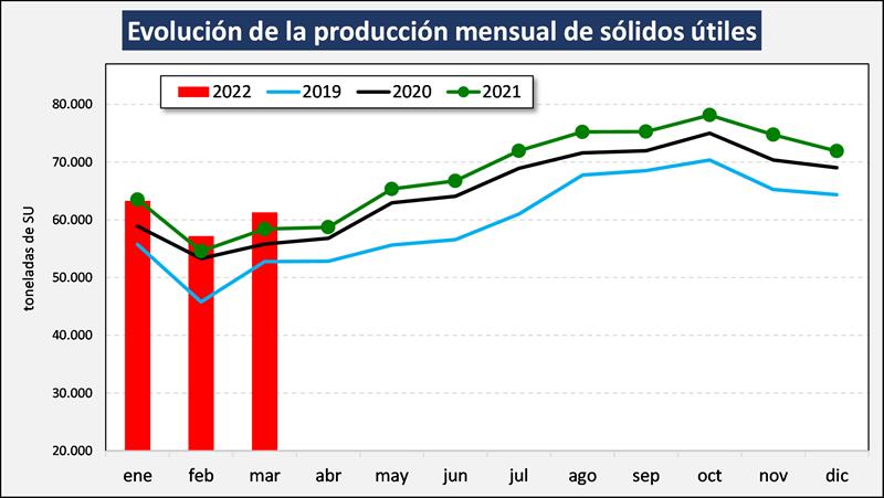 Un dato importante que arroja el gráfico anterior, es que hacía 30 meses consecutivos que la producción crecía interanualmente y en enero 2022, aunque leve, se ha dado una caída, pero teniendo en cuenta que en los dos eneros anteriores la producción creció 5,5% y 7,7%, lo cual hace que comparemos con una base muy alta. Además, esa caída hoy se vuelve a revertir con las subas interanuales de febrero y marzo.