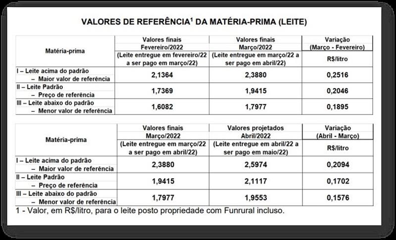El directorio del Conseleite Santa Catarina, reunido el 22 de abril de 2022, en cumplimiento de lo dispuesto en el artículo 15 de su Estatuto, inciso I, aprueba y divulga los valores de referencia de la materia prima leche, realizados en marzo de 2022 y la proyección de valores de referencia para el mes de abril de 2022.