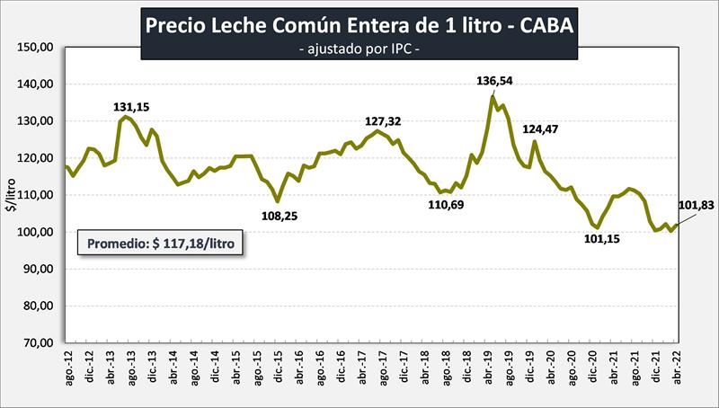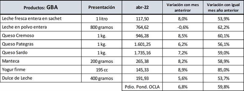 Según datos publicados por la Dirección General de Estadísticas y Censos - Ministerio de Hacienda del Gobierno de la Ciudad de Buenos Aires, los precios de los productos lácteos de esta canasta, tuvieron un crecimiento mensual promedio ponderado del 8,0%, cuatrimestral del 23,9%, e interanual del 61,6%.  El ponderado es elaborado por OCLA sobre el mismo criterio mencionado para la canasta GBA de INDEC.