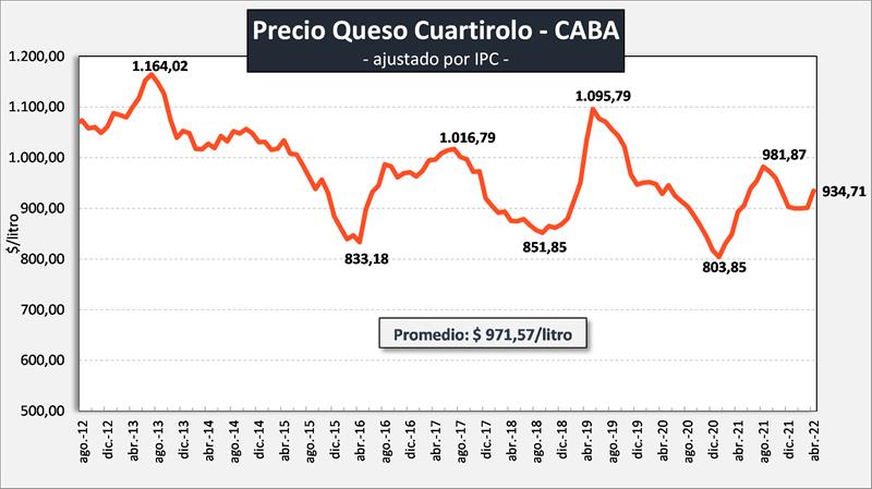 En los tres gráficos siguientes se toman como referencia productos básicos como la leche común entera de litro, el queso cuartirolo y el yogur bebible de litro, en este caso de CABA por contar con una serie un poco más prolongada en el tiempo y se la actualiza por el índice de precios al consumidor. En la leche común entera de litro se observa que el precio de abril de 2022, es 1,6% superior al mes anterior (+7,8% en moneda corriente), y se encuentra 7,1% por debajo de igual mes del año anterior. Siguiendo en el análisis a moneda constante, el precio de abril de 2022 subió un poco respecto al de marzo, que fue el más bajo de la serie analizada, y se ubica 13,1% por debajo de la media de la serie y es 25,4% más bajo que el máximo alcanzado a mediados del 2019.