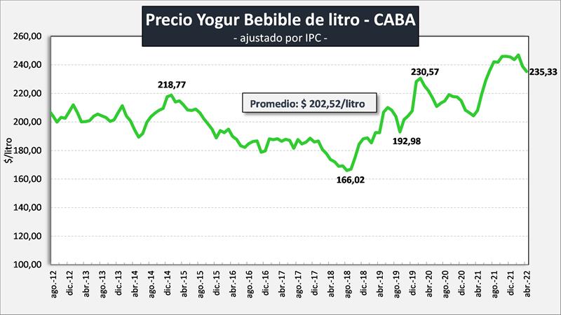La situación de los yogures bebibles de litro es diferente, sostienen el nivel de consumo de la categoría, sus precios se ajustaron con el ritmo inflacionario, frenándose en los últimos dos meses de 2021, cayendo en enero de 2022 y recuperando un 1,3% en febrero último y cayendo en marzo, y ahora en abril -1,6%. Lamentablemente tiran para abajo el promedio del mix, ya que su aumento de ventas no fue acompañado por las ventas de yogures en pote, postres y flanes que tienen un mayor valor por litro equivalente.