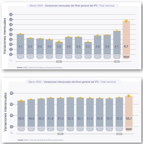 El Nivel general del Índice de precios al consumidor (IPC) representativo del total de hogares del país registró en abril una variación de 6,0% con relación al mes anterior, 23,1% en el primer cuatrimestre y del 58,0% en el interanual.
