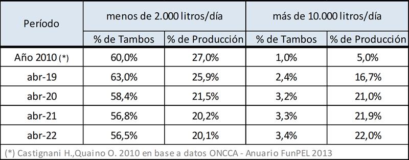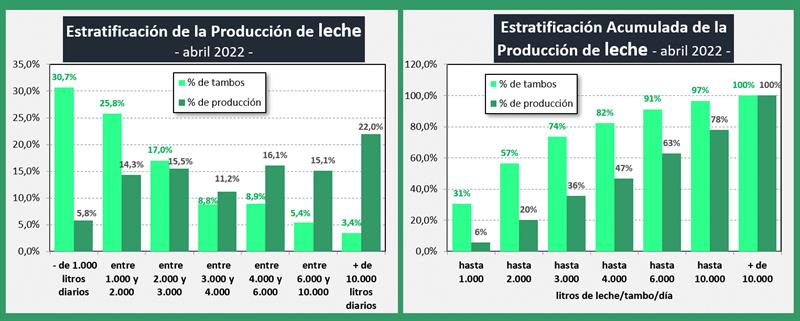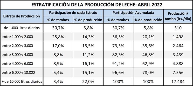 Puede verse en los meses de abril de los últimos cuatro años (2019-2022), y también comparado con datos disponibles del año 2010, que en un extremo disminuye la participación tanto en cantidad de tambos como en el volumen de producción de las unidades productivas de menos de 2.000 litros diarios y en el otro extremo de la estratificación, se incrementa la participación de las unidades de más de 10.000 litros diarios.