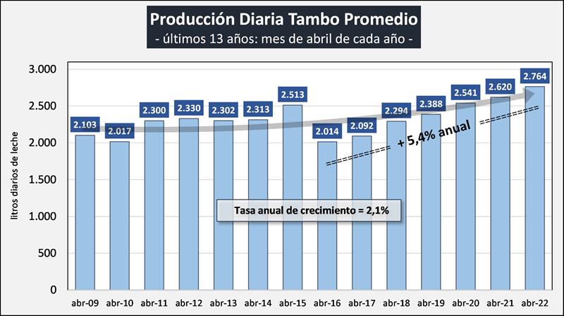 Sobre la base de la producción mensual y la cantidad anual de tambos (SENASA), podemos inferir el tamaño del tambo promedio, unos 2.764 litros de leche diarios para abril de 2022, un 5,5% más que el año anterior. Si evaluamos su comportamiento en el tiempo, a pesar de la disminución en el número de unidades productivas y en el número de vacas, el tambo promedio presenta en el período 2009-2022 una tasa de crecimiento acumulada anual del 2,1%, lo que permite el sostenimiento e incluso aumento de los niveles productivos agregados a nivel país.