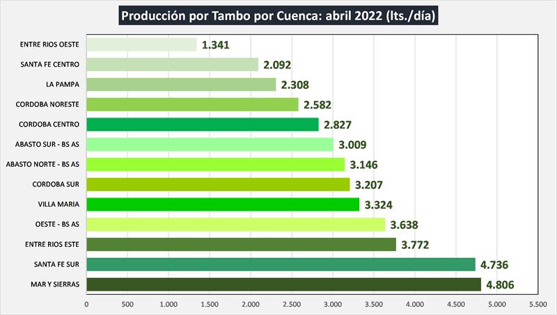 La producción promedio diaria por tambo y por provincia que graficamos aquí es la que arrojan los datos de SIGLeA – LUME sobre 8.037 liquidaciones de leche mensuales provenientes de 363 industrias (abril 2022). Al igual que el gráfico superior, el de abajo muestra la producción promedio por tambo por día y por Cuenca, donde vemos por ejemplo que para una provincia como Entre Ríos que tiene uno de los volúmenes promedio más bajo, su Cuenca Este es una de las más importante en volumen del país y lo mismo ocurre con la provincia de Santa Fe y su Cuenca Sur.