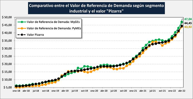 Se observa en el gráfico una mayor capacidad de pago en el mes de abril/22 del segmento de MyGEs que del segmento PyMEs, $ 47,04 y $ 43,92, respectivamente. La capacidad de pago de las MyGES estuvo $ 2,59 por encima del precio real pagado y el de las PyMEs $ 0,53 por debajo.