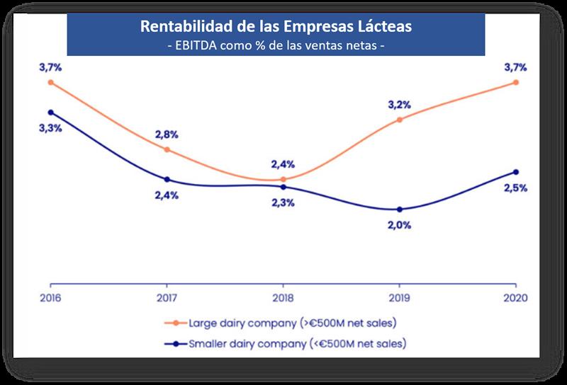 Según el análisis de más de 300 empresas lácteas en Europa Occidental, es evidente que el tamaño es el camino a seguir en la industria láctea europea. Con un EBITDA medio del 3,7% de las ventas netas en 2020, las grandes empresas lácteas (>500 millones de euros en ventas netas) generaron márgenes más altos que sus competidores más pequeños (2,5%) durante la pandemia.