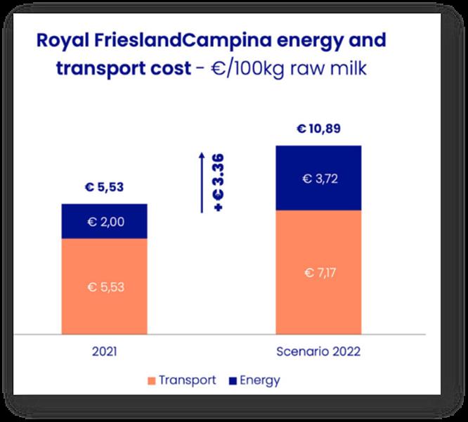 Esto puede ser una ventaja sustancial en un momento en que los precios de la energía aumentan en tres dígitos y los precios del transporte son más altos que nunca. Para poner esto en perspectiva, FrieslandCampina gastó 2,00 € en energía y 5,53 € en transporte por cada 100 kg de leche cruda procesada en 2021. Si la cooperativa incurriera en el mismo aumento del costo de energía que se proyecta para los hogares holandeses (86 %, CBS 2022), y el aumento total del 30 % en el precio del gasóleo debía calcularse en sus costos de transporte, la cooperativa vería aumentar los costos combinados de energía y transporte en 3,36 €/100 kg. Ese dinero tendría que salir de los bolsillos de los agricultores o consumidores, por lo que cualquier medida de reducción de costos, como la cobertura de los contratos de energía y transporte, mejoraría en gran medida la competitividad de los productores.